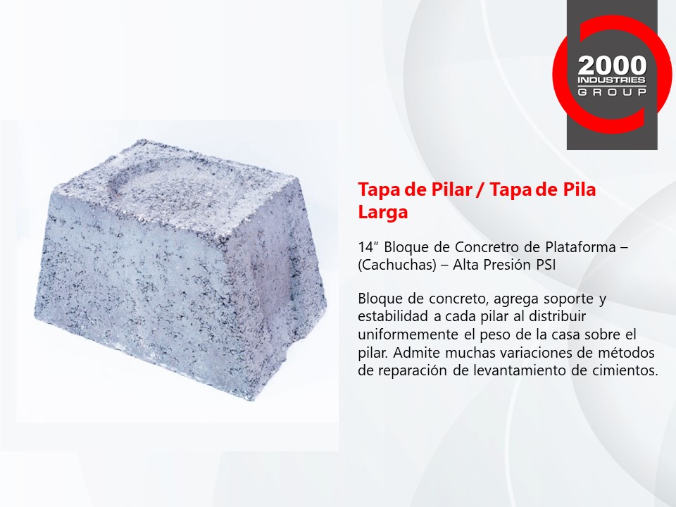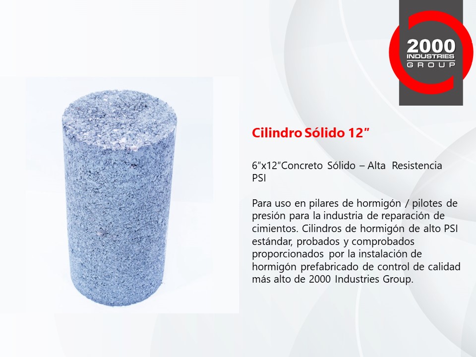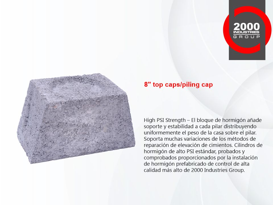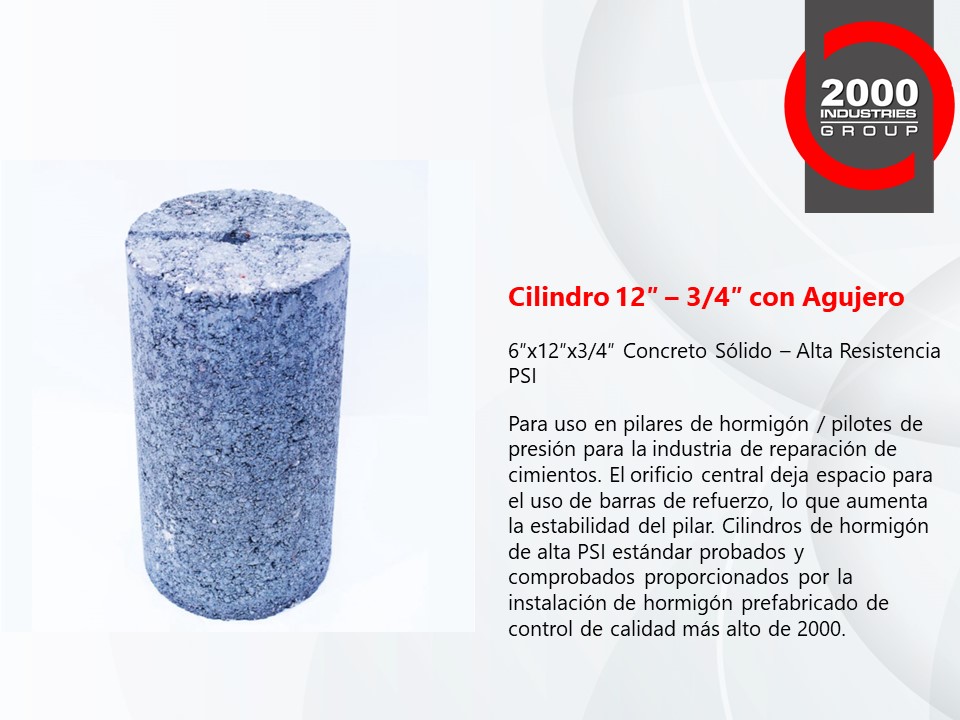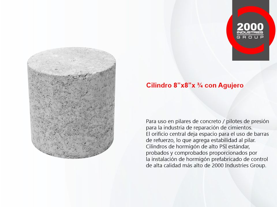 Nuestros Cilindros, Tapas Superiores y Bloques de Concreto de Alta Resistencia PSI son la mejor opción para usar en pilares de concreto y pilotes de presión para la industria de reparación de cimientos. Probado y comprobado, nuestro alto PSI estándar es proporcionado por el control de calidad más alto de 2000 Industries Group.