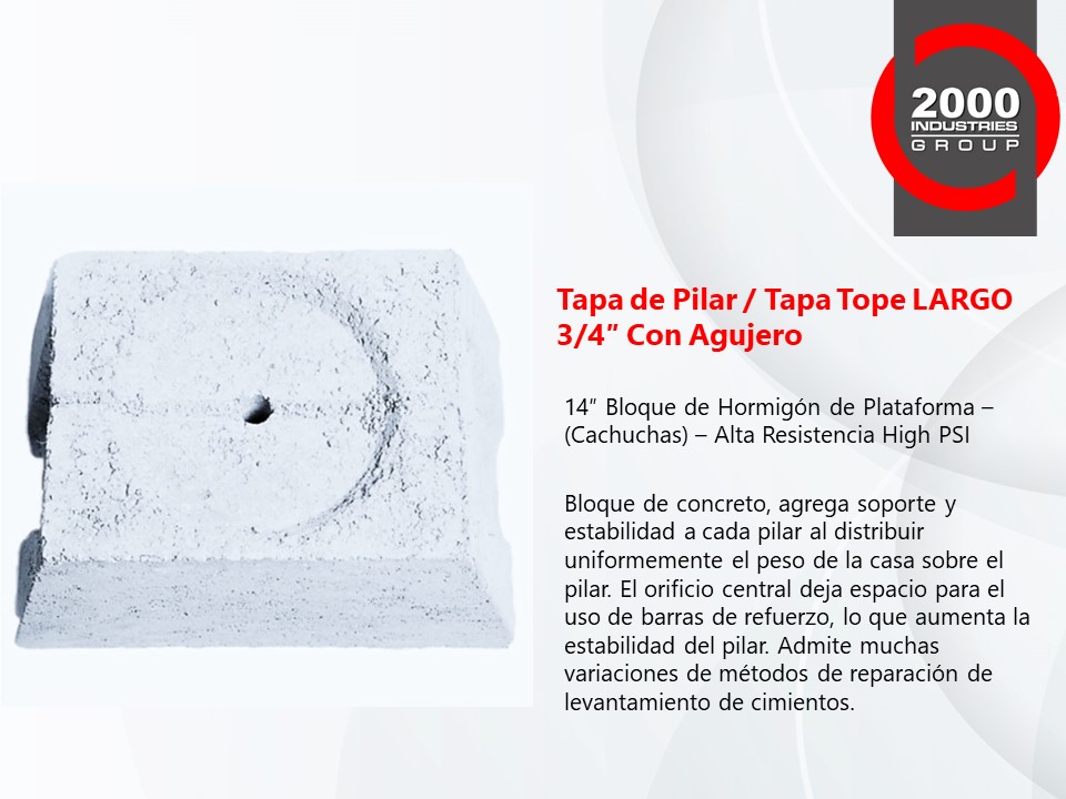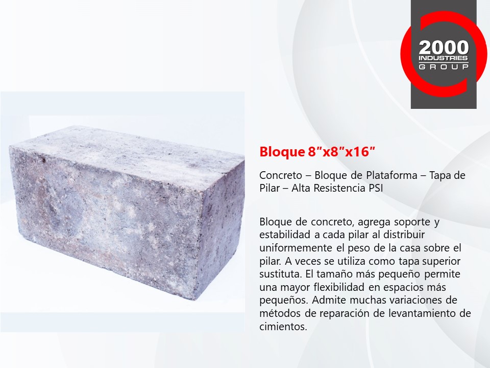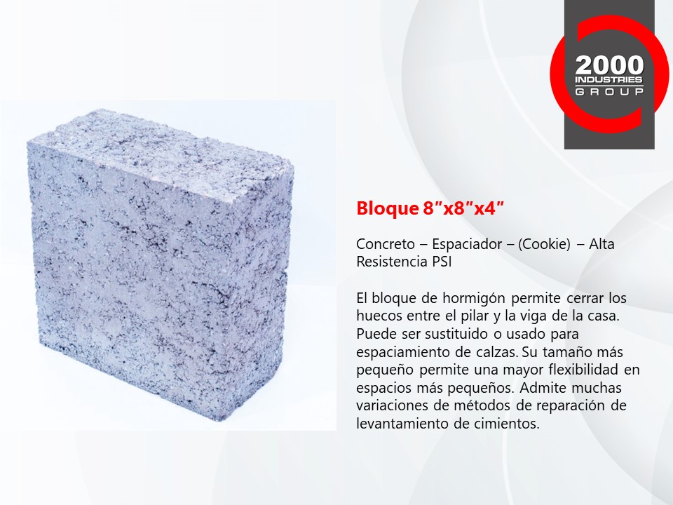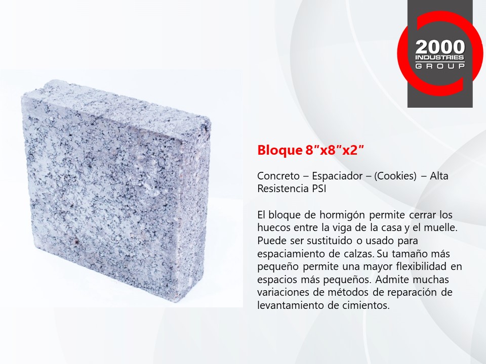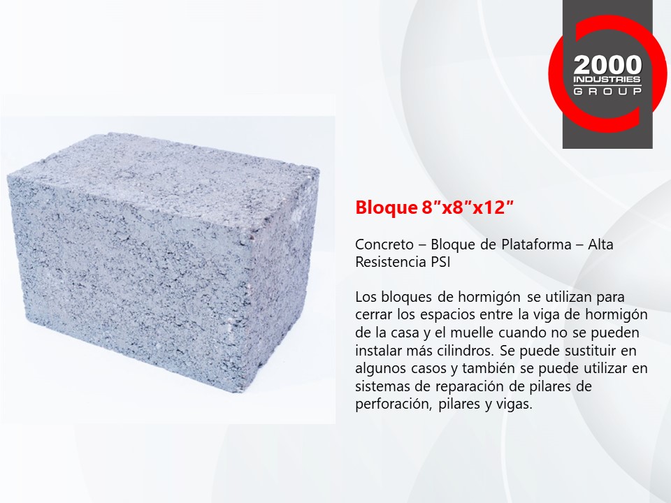 Nuestros Cilindros, Tapas Superiores y Bloques de Concreto de Alta Resistencia PSI son la mejor opción para usar en pilares de concreto y pilotes de presión para la industria de reparación de cimientos. Probado y comprobado, nuestro alto PSI estándar es proporcionado por el control de calidad más alto de 2000 Industries Group.
